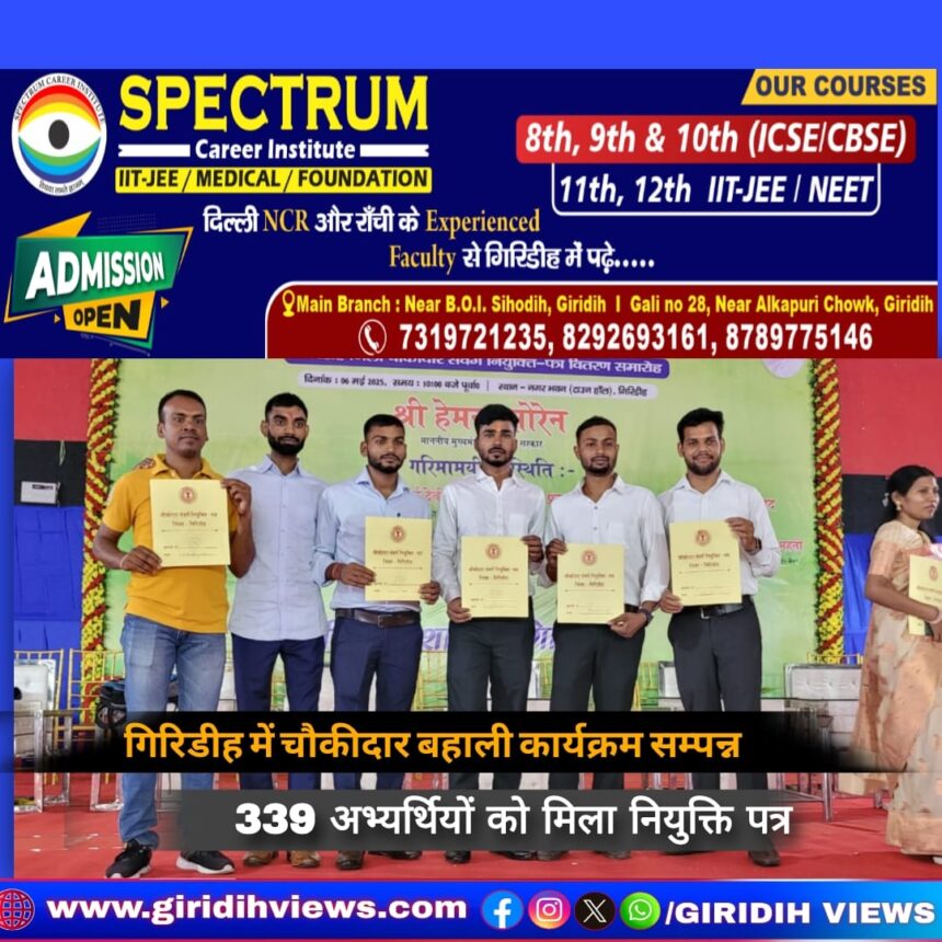 गिरिडीह : गिरिडीह नगर भवन में मंगलवार को चौकीदार के रिक्त पदों पर नियुक्ति हेतु चयनित अभ्यर्थियों को नियुक्ति पत्र वितरण कार्यक्रम का आयोजन भव्य रूप में किया गया। कार्यक्रम में कुल 339 अभ्यर्थियों को नियुक्ति पत्र प्रदान किया गया, जिनमें 42 महिलाएं और 297 पुरुष अभ्यर्थी शामिल थे।