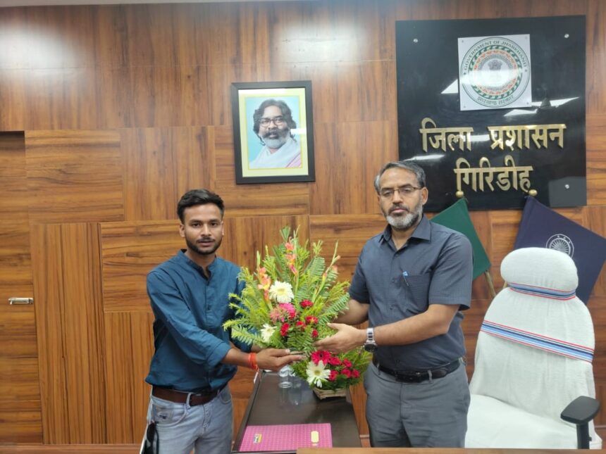 गिरिडीह: झारखंड मुक्ति मोर्चा (झामुमो) के युवा नेता हर्ष सिन्हा ने गिरिडीह जिले के नवनियुक्त उपायुक्त श्री राम निवास यादव से शिष्टाचार मुलाकात की। इस दौरान उन्होंने श्री यादव को नई जिम्मेदारी संभालने पर हार्दिक शुभकामनाएं एवं बधाई दी।