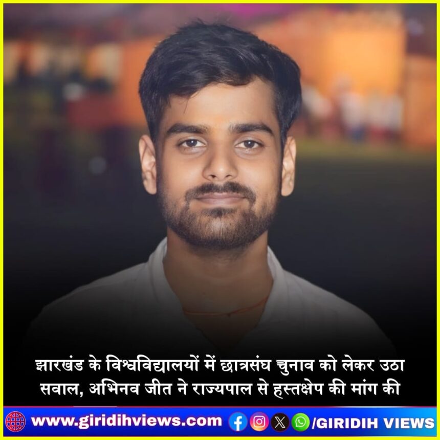 झारखंड के विश्वविद्यालयों में छात्रसंघ चुनाव न कराए जाने को लेकर छात्रनेता और अखिल भारतीय विद्यार्थी परिषद (ABVP) के पूर्व रांची महानगर संगठन मंत्री अभिनव जीत ने सरकार और विश्वविद्यालय प्रशासन पर गंभीर आरोप लगाए हैं। उन्होंने इसे लोकतंत्र की हत्या करार देते हुए कहा कि छात्रसंघ चुनाव नहीं कराना, छात्रों को उनके अधिकारों से वंचित करने जैसा है।