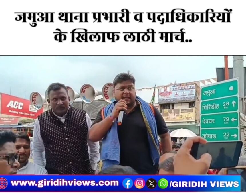 गिरिडीह :जमुआ थाना क्षेत्र में रविवार को पुलिस और प्रशासनिक अधिकारियों के कथित दुर्व्यवहार व भ्रष्टाचार के खिलाफ बड़ा विरोध प्रदर्शन किया गया। सैकड़ों की संख्या में ग्रामीण महिला-पुरुषों ने लाठी मार्च निकालकर थाना का घेराव किया और कार्रवाई की मांग की।