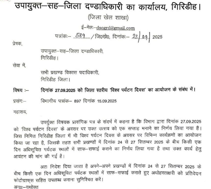 उपायुक्त-सह-जिला दंडाधिकारी, गिरिडीह के निर्देश पर सभी प्रखंड विकास पदाधिकारियों को अपने-अपने प्रखंडों में अधिसूचित पर्यटन स्थलों की साफ-सफाई कराने का आदेश दिया गया है। यह कार्य 24 से 27 सितंबर 2025 के बीच पूरा करना है। साथ ही साफ-सफाई के दौरान की गई गतिविधियों का फोटो एवं प्रतिवेदन जिला कार्यालय को भेजने का निर्देश भी दिया गया है।