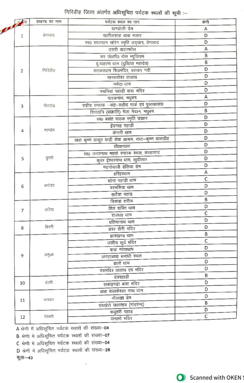 गिरिडीह जिले में कुल 43 अधिसूचित पर्यटन स्थल हैं, जिन्हें चार श्रेणियों (A, B, C, D) में बांटा गया है। इनमें A श्रेणी के 4, B श्रेणी के 7, C श्रेणी के 4 तथा D श्रेणी के 28 स्थल शामिल हैं।