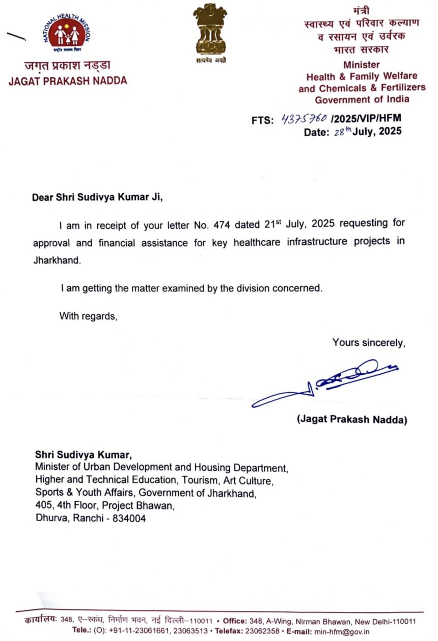उन्होंने केंद्रीय स्वास्थ्य मंत्री जे.पी. नड्डा का आभार जताते हुए कहा कि केंद्र के सहयोग से झारखंड में मेडिकल कॉलेज खोलने का मार्ग प्रशस्त हुआ है। जुलाई माह में मंत्री सुदिव्य कुमार ने खुद केंद्रीय स्वास्थ्य मंत्री को पत्र लिखकर राज्य की चुनौतियों का जिक्र किया था। उन्होंने बताया था कि करीब 3.92 करोड़ की आबादी वाले झारखंड में फिलहाल केवल 9 मेडिकल कॉलेज हैं, जबकि राष्ट्रीय मानक के अनुसार यहां 39 मेडिकल कॉलेज की आवश्यकता है।