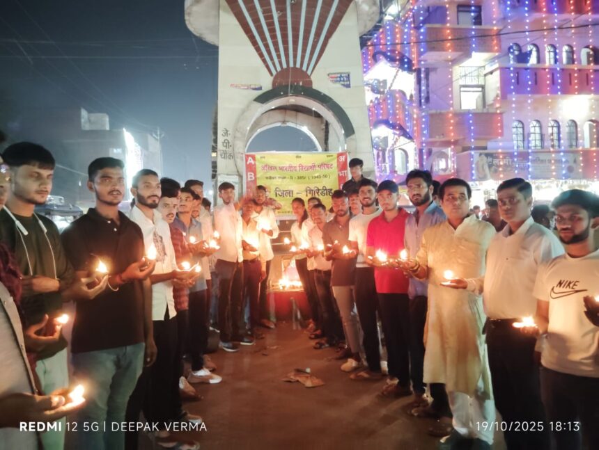 गिरिडीह : छोटी दीपावली की शुभ संध्या पर अखिल भारतीय विद्यार्थी परिषद (एबीवीपी) गिरिडीह नगर इकाई की ओर से “एक दिया शहीदों के नाम” कार्यक्रम का आयोजन शहर के टावर चौक पर किया गया। इस अवसर पर परिषद के कार्यकर्ताओं ने सैकड़ों दीप जलाकर मातृभूमि के लिए अपने प्राण न्योछावर करने वाले शहीदों को नमन किया।