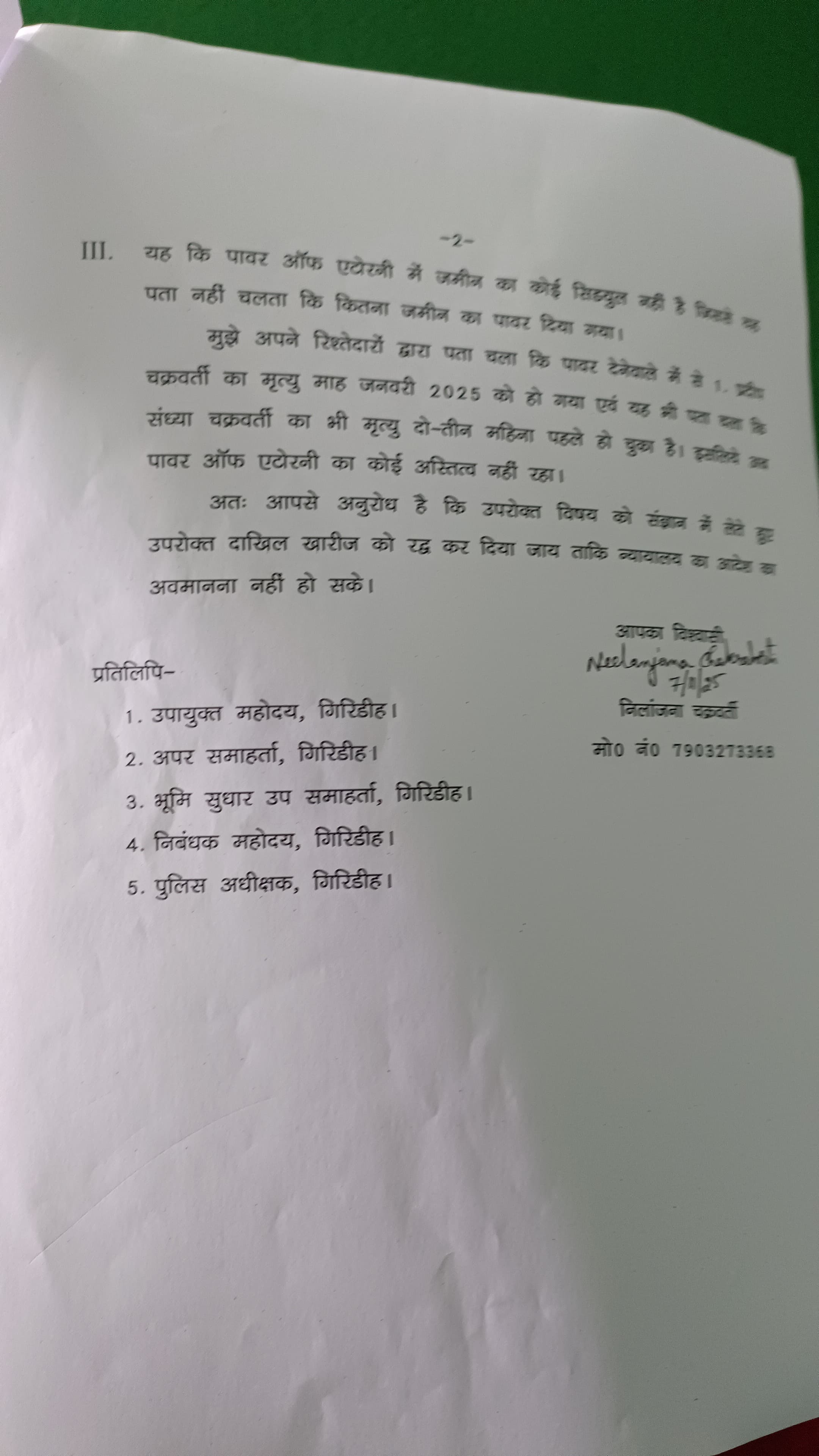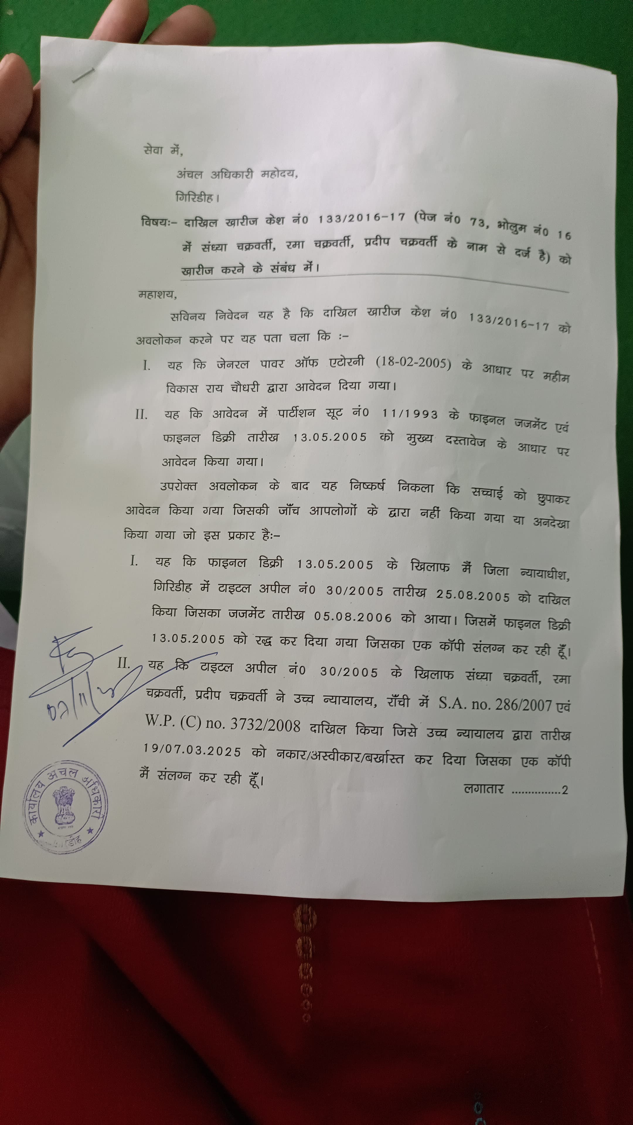 निलांजना ने इस संबंध में भूमि सुधार समाहर्ता, अंचल अधिकारी, निबंधक अधिकारी एवं उपायुक्त गिरिडीह को आवेदन देकर उक्त दाखिल-खारिज को रद्द करने और निबंधन रोकने की मांग की है।